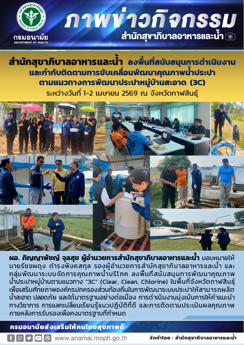 ผอ. ภิญญาพัชญ์ จุลสุข ผู้อำนวยการสำนักสุขาภิบาลอาหารและน้ำ มอบหมายให้ นายรัชชผดุง ดำรงพิงคสกุล รองผู้อำนวยการสำนักสุขาภิบาลอาหารและน้ำ และ กลุ่มพัฒนาระบบจัดการคุณภาพน้ำบริโภค ลงพื้นที่สนับสนุนการพัฒนาคุณภาพน้ำประปาหมู่บ้านตามแนวทาง “3C” (Clear, Clean, Chlorine) ในพื้นที่จังหวัดกาฬสินธุ์ เพื่อเสริมศักยภาพองค์กรปกครองส่วนท้องถิ่นในการพัฒนาระบบประปาให้สามารถผลิตน้ำสะอาด ปลอดภัย และได้มาตรฐานอย่างต่อเนื่อง การดำเนินงานมุ่งเน้นการให้คำแนะนำ ทางวิชาการ การแลกเปลี่ยนเรียนรู้แนวปฏิบัติที่ดี และการติดตามประเมินผลคุณภาพภายหลังการรับรองเพื่อคงมาตรฐานที่กำหนด
