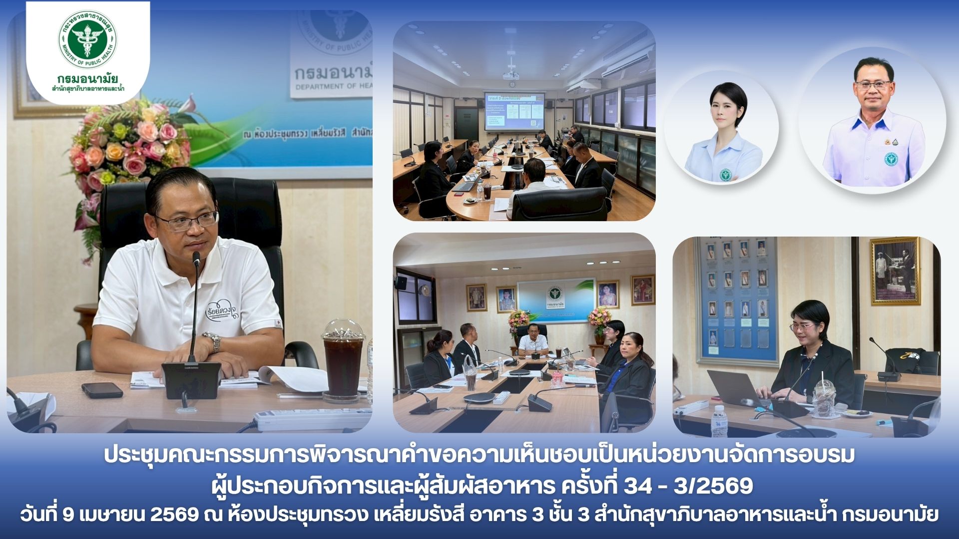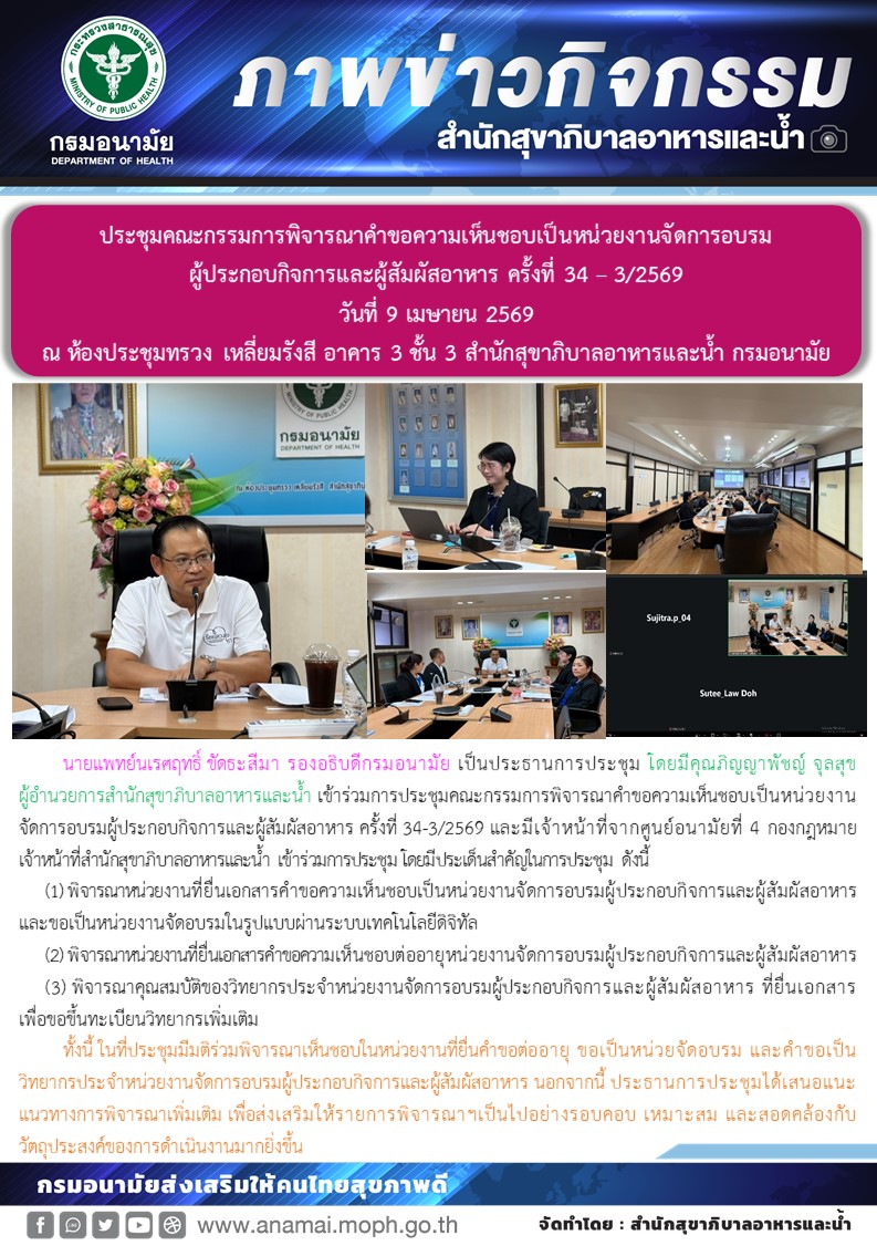 นายแพทย์นเรศฤทธิ์ ขัดธะสีมา รองอธิบดีกรมอนามัย เป็นประธานการประชุม โดยมีคุณภิญญาพัชญ์ จุลสุข ผู้อำนวยการสำนักสุขาภิบาลอาหารและน้ำ เข้าร่วมการประชุมคณะกรรมการพิจารณาคำขอความเห็นชอบเป็นหน่วยงานจัดการอบรมผู้ประกอบกิจการและผู้สัมผัสอาหาร ครั้งที่ 34-3/2569 และมีเจ้าหน้าที่จากศูนย์อนามัยที่ 4 กองกฎหมาย เจ้าหน้าที่สำนักสุขาภิบาลอาหารและน้ำ เข้าร่วมการประชุม โดยมีประเด็นสำคัญในการประชุม ดังนี้