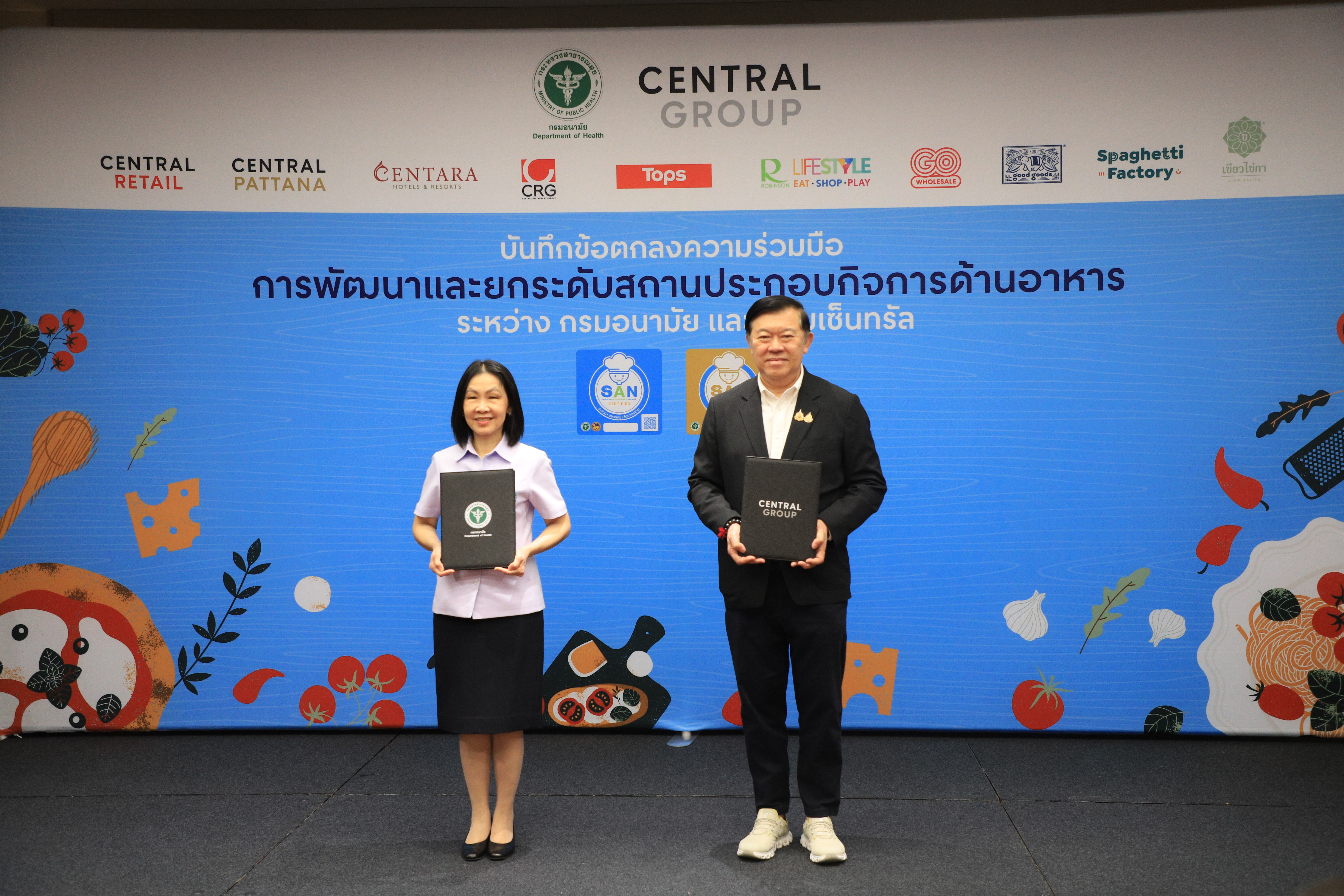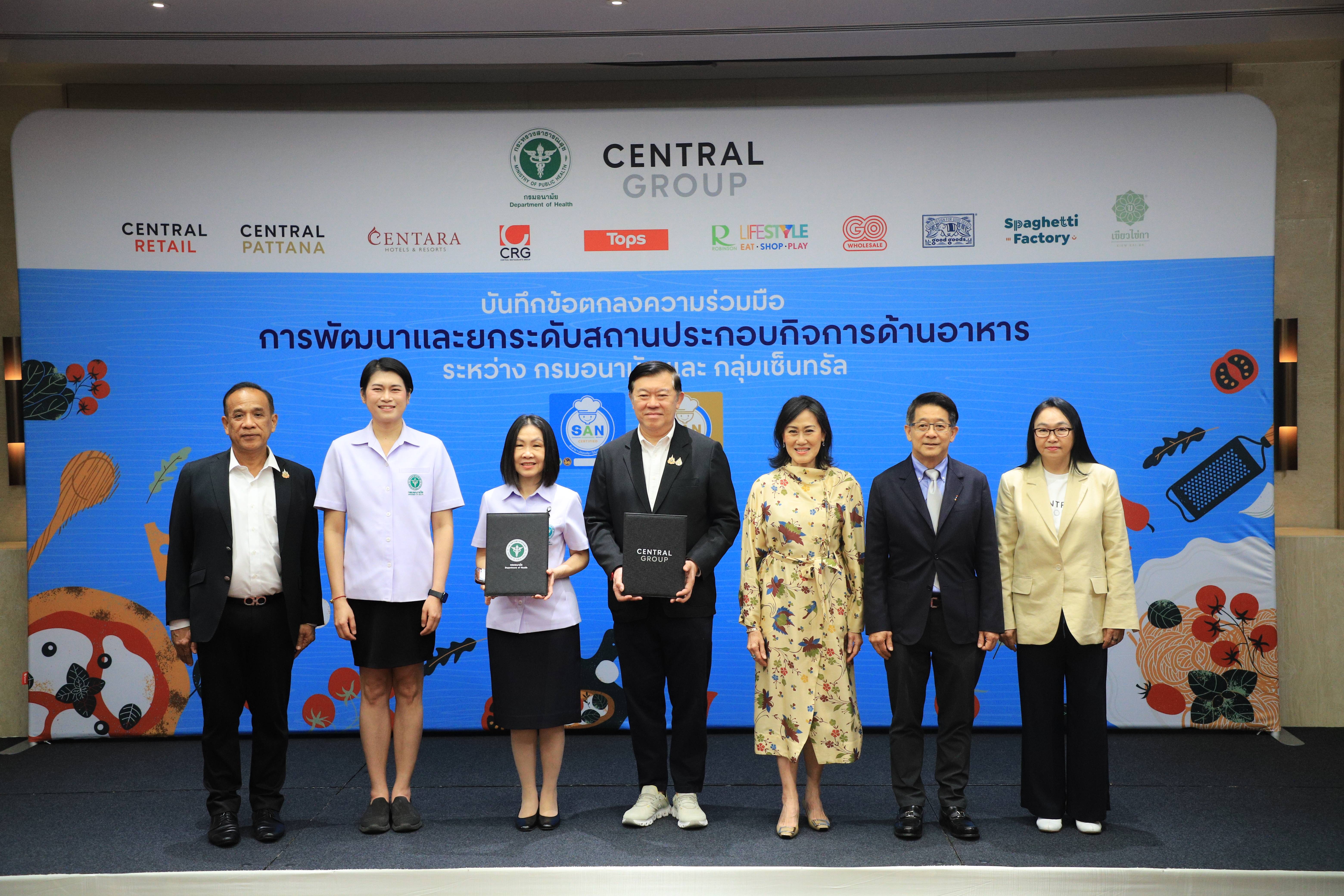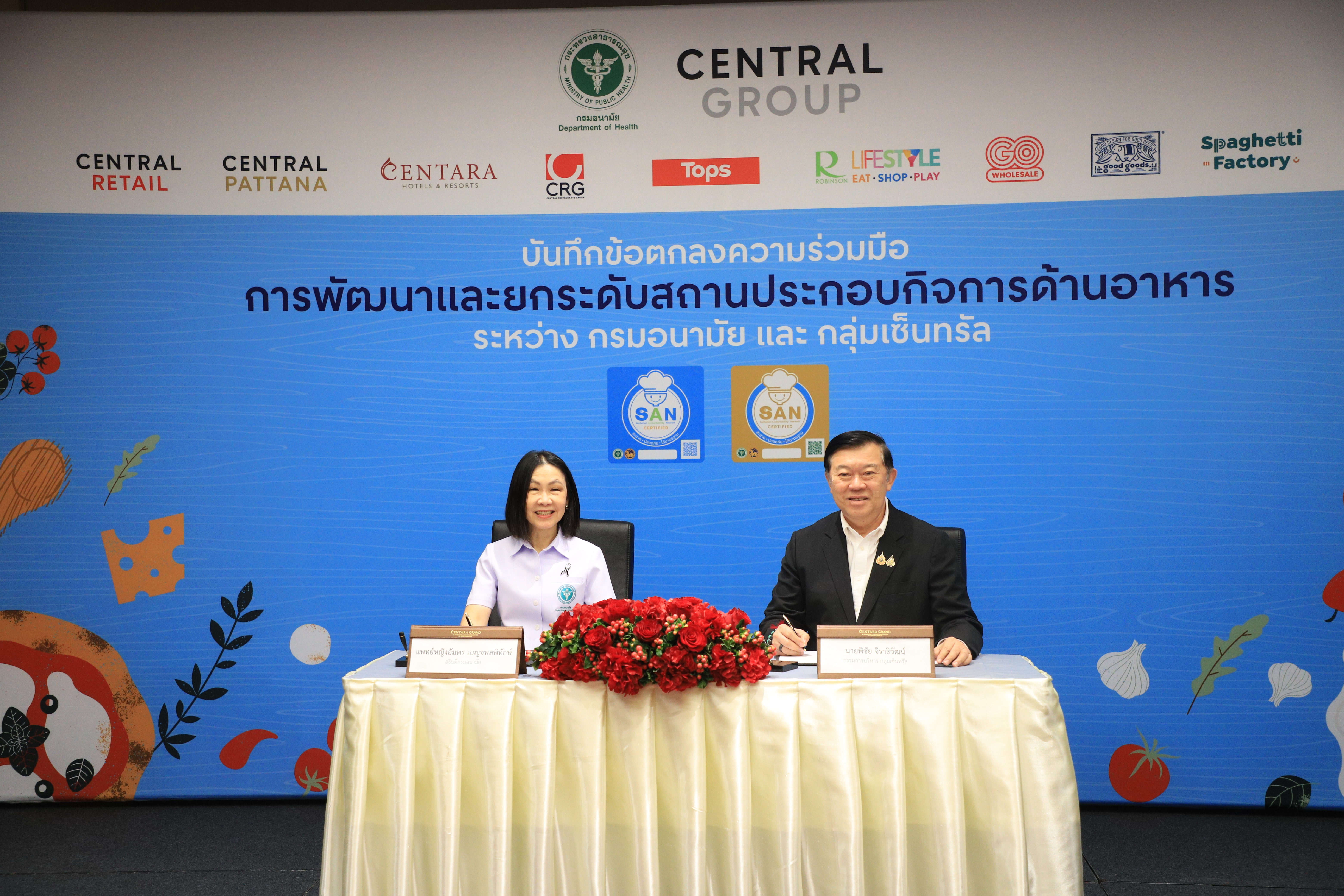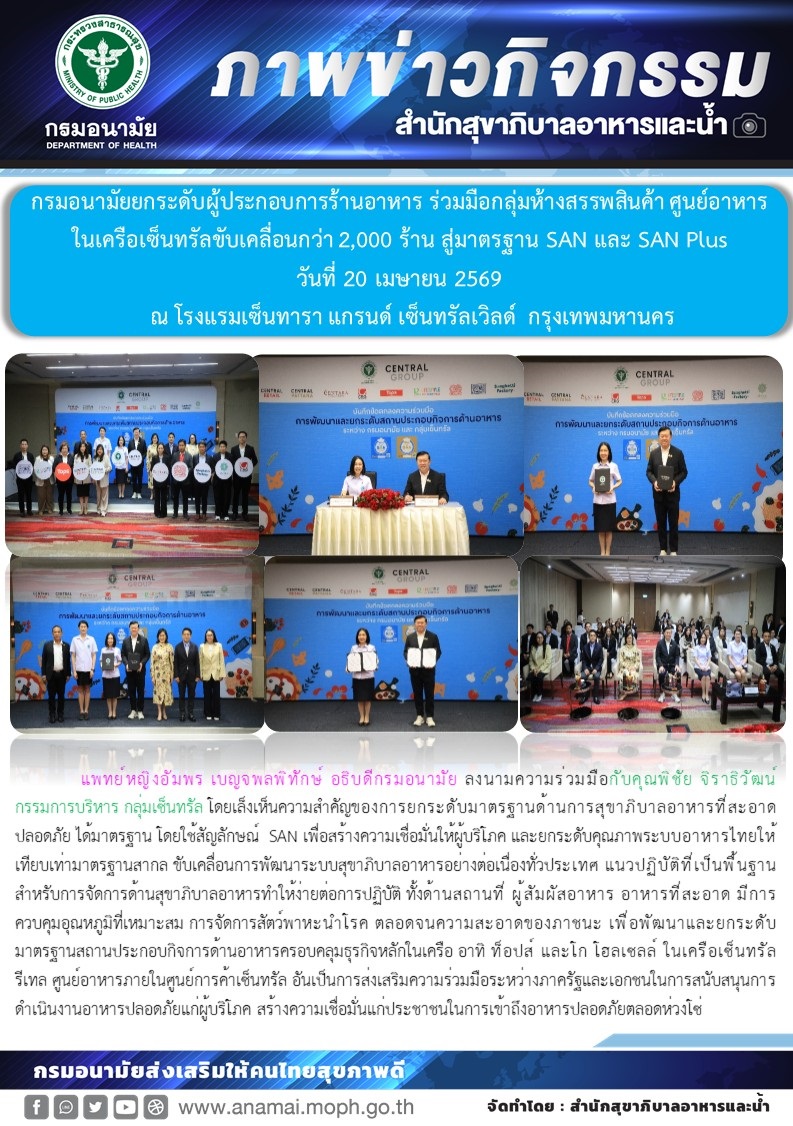 แพทย์หญิงอัมพร เบญจพลพิทักษ์ อธิบดีกรมอนามัย ลงนามความร่วมมือกับคุณพิชัย จิราธิวัฒน์ กรรมการบริหาร กลุ่มเซ็นทรัล โดยเล็งเห็นความสำคัญของการยกระดับมาตรฐานด้านการสุขาภิบาลอาหารที่สะอาด ปลอดภัย ได้มาตรฐาน โดยใช้สัญลักษณ์ SAN เพื่อสร้างความเชื่อมั่นให้ผู้บริโภค และยกระดับคุณภาพระบบอาหารไทยให้เทียบเท่ามาตรฐานสากล ขับเคลื่อนการพัฒนาระบบสุขาภิบาลอาหารอย่างต่อเนื่องทั่วประเทศ แนวปฏิบัติที่เป็นพื้นฐานสำหรับการจัดการด้านสุขาภิบาลอาหารทำให้ง่ายต่อการปฏิบัติ ทั้งด้านสถานที่ ผู้สัมผัสอาหาร อาหารที่สะอาด มีการควบคุมอุณหภูมิที่เหมาะสม การจัดการสัตว์พาหะนำโรค ตลอดจนความสะอาดของภาชนะ เพื่อพัฒนาและยกระดับมาตรฐานสถานประกอบกิจการด้านอาหารครอบคลุมธุรกิจหลักในเครือ อาทิ ท็อปส์ และโก โฮลเซลล์ ในเครือเซ็นทรัลรีเทล ศูนย์อาหารภายในศูนย์การค้าเซ็นทรัล อันเป็นการส่งเสริมความร่วมมือระหว่างภาครัฐและเอกชนในการสนับสนุนการดำเนินงานอาหารปลอดภัยแก่ผู้บริโภค สร้างความเชื่อมั่นแก่ประชาชนในการเข้าถึงอาหารปลอดภัยตลอดห่วงโซ่