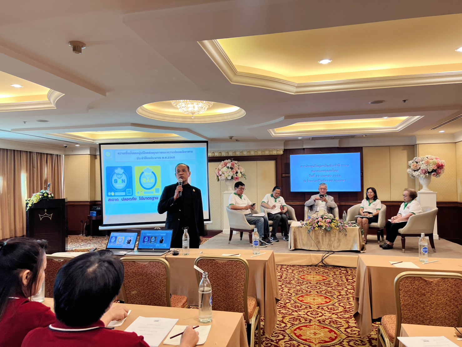 ผอ.ภิญญาพัชญ์ จุลสุข ผู้อำนวยการสำนักสุขาภิบาลอาหารและน้ำ มอบหมายให้ นายสุชาติ สุขเจริญ รองผู้อำนวยการสำนักสุขาภิบาลอาหารและน้ำ และหัวหน้ากลุ่มพัฒนาระบบสุขาภิบาลอาหาร เข้าร่วมประชุมใหญ่สามัญสมาคมตลาดสดไทย ประจำปี พ.ศ. 2569 โดยมีนายปริญญา ธรรมวัฒนะ นายกสมาคมตลาดสดไทย เป็นประธานการประชุม ผู้แทนสำนักสุขาภิบาลอาหารและน้ำ ได้นำเสนอผลสำรวจความเชื่อมั่นของผู้บริโภคต่อคุณภาพและความปลอดภัยอาหารประจำปีงบประมาณ พ.ศ.2568 และประเด็นมาตรฐาน SAN / SAN Plus รวมถึงการบังคับใช้กฎหมาย ทั้งนี้ ในการประชุมครั้งนี้ได้มีการเสนวาหัวข้อ “ผ่าวิกฤตซัพพลายเชนโลกด้วย AI” ในประเด็นหลักคือ เจาะลึกผลกระทบจากสงครามสหรัฐ - อิหร่าน ทำให้สายการผลิตชะงักและต้นทุนพุ่งสูง และบทบาทของ DTE ในการใช้ AI สร้างระบบ Data เพื่อให้ตลาดสดและร้านอาหารมองเห็นสต๊อกวัตถุดิบร่วมกันแบบ Real-time ลดความเสี่ยงในการขาดแคลนสินค้า แลกเปลี่ยนแนวคิดในสถานการณ์ปัจจุบันแก่คณะกรรมการสมาคมตลาดสดไทย