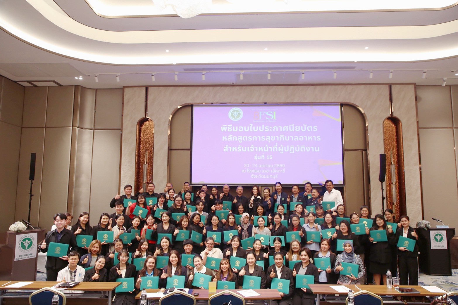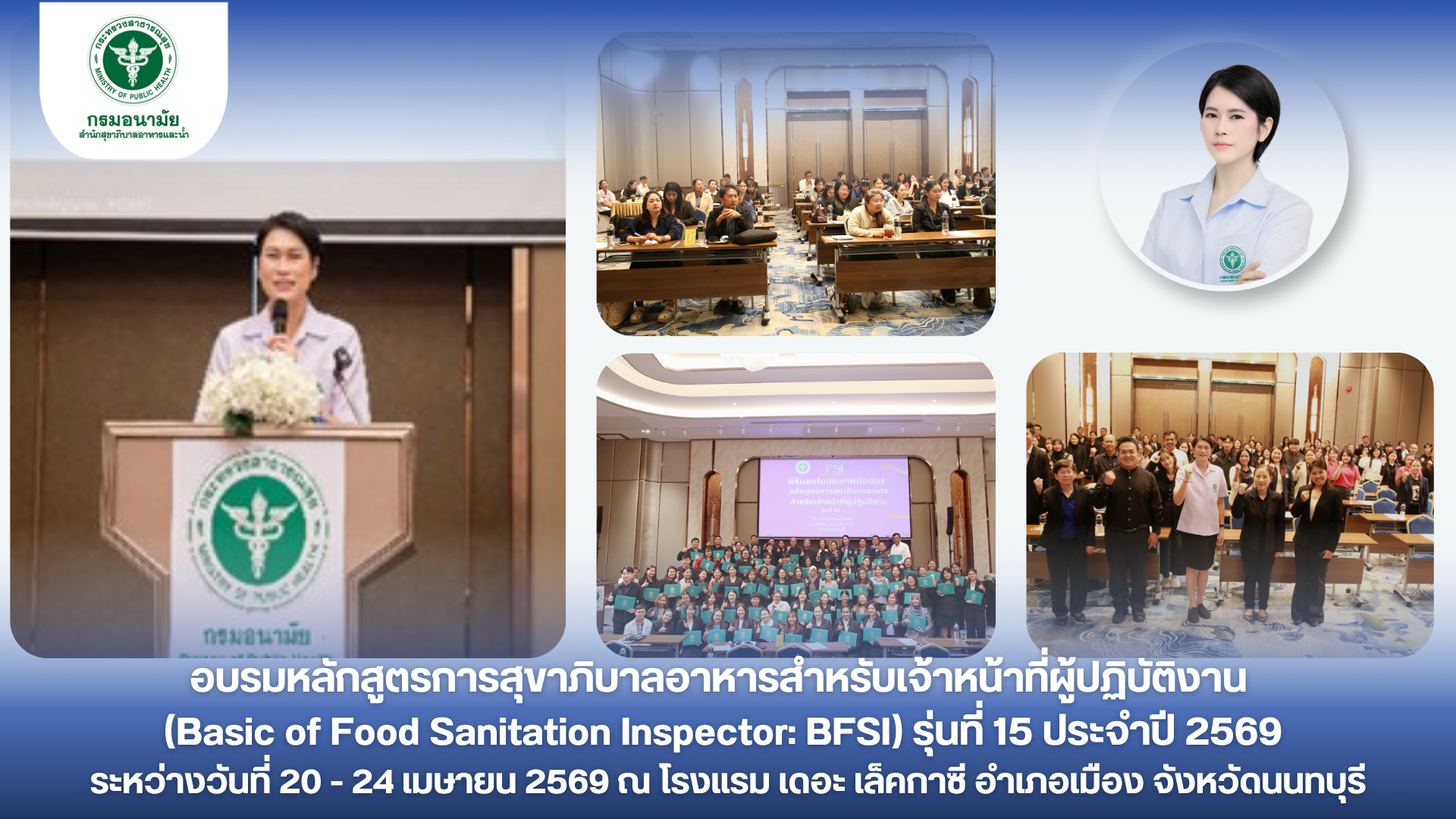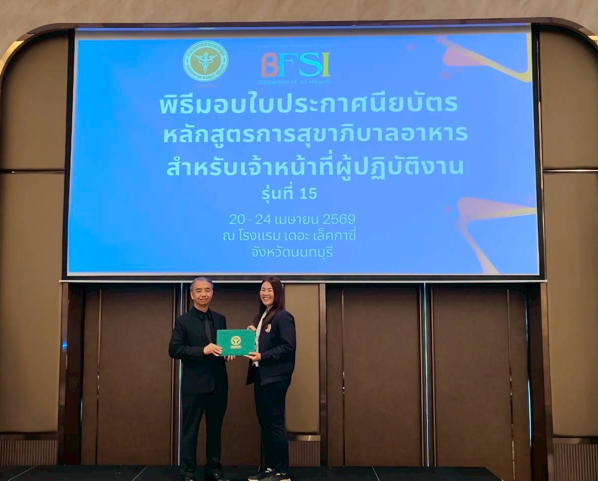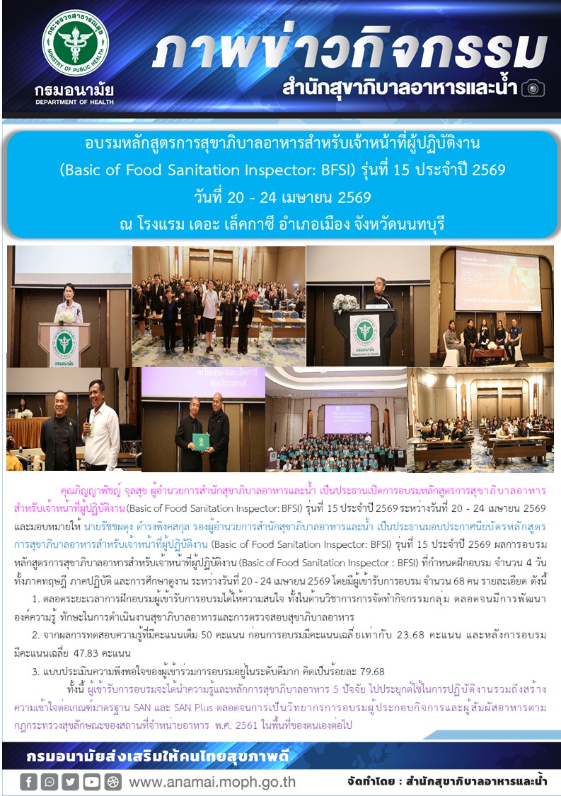คุณภิญญาพัชญ์ จุลสุข ผู้อำนวยการสำนักสุขาภิบาลอาหารและน้ำ เป็นประธานเปิดการอบรมหลักสูตรการสุขาภิบาลอาหารสำหรับเจ้าหน้าที่ผู้ปฏิบัติงาน (Basic of Food Sanitation Inspector: BFSI) รุ่นที่ 15 ประจำปี 2569 ระหว่างวันที่ 20 - 24 เมษายน 2569 และมอบหมายให้ นายรัชชผดุง ดำรงพิงคสกุล รองผู้อำนวยการสำนักสุขาภิบาลอาหารและน้ำ เป็นประธานมอบประกาศนียบัตรหลักสูตรการสุขาภิบาลอาหารสำหรับเจ้าหน้าที่ผู้ปฏิบัติงาน (Basic of Food Sanitation Inspector: BFSI) รุ่นที่ 15 ประจำปี 2569 ผลการอบรมหลักสูตรการสุขาภิบาลอาหารสำหรับเจ้าหน้าที่ผู้ปฏิบัติงาน (Basic of Food Sanitation Inspector : BFSI) ที่กำหนดฝึกอบรม จำนวน 4 วัน ทั้งภาคทฤษฎี ภาคปฏิบัติ และการศึกษาดูงาน ระหว่างวันที่ 20 - 24 เมษายน 2569 โดยมีผู้เข้ารับการอบรม จำนวน 68 คน รายละเอียด ดังนี้