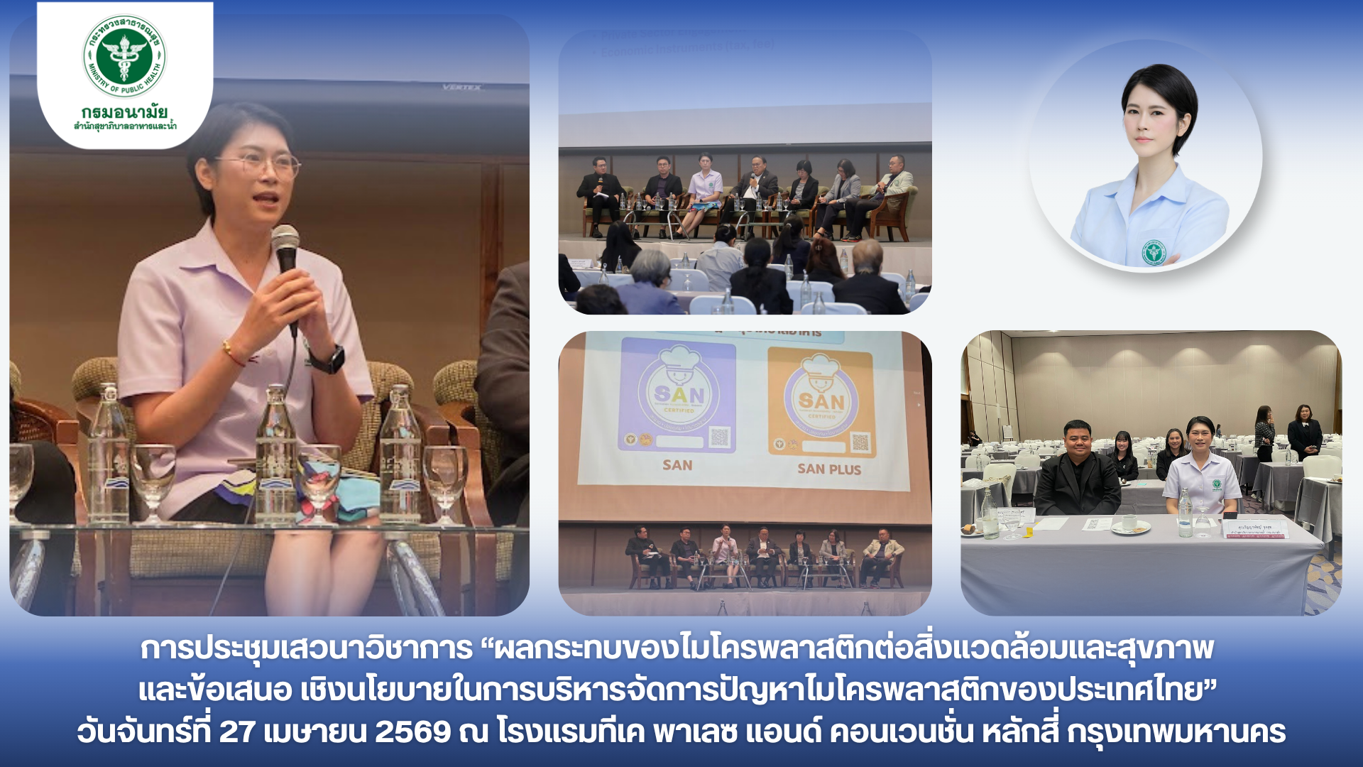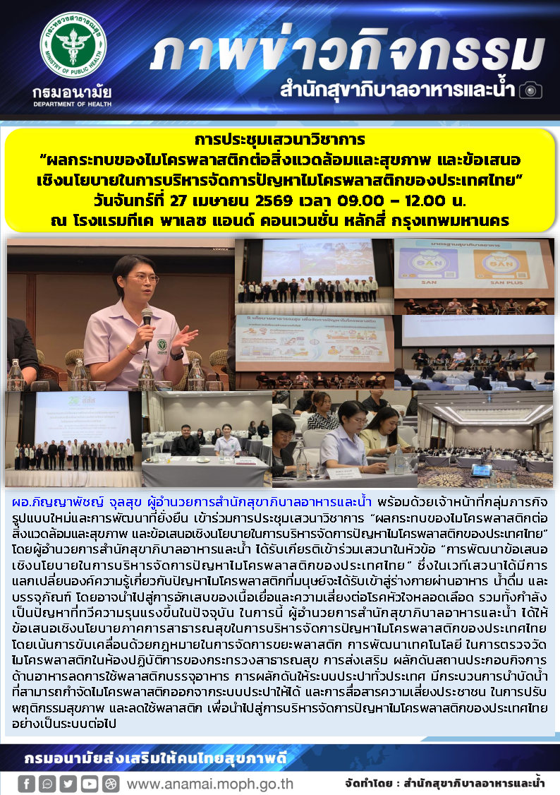 ผอ.ภิญญาพัชญ์ จุลสุข ผู้อำนวยการสำนักสุขาภิบาลอาหารและน้ำ พร้อมด้วยเจ้าหน้าที่กลุ่มภารกิจรูปแบบใหม่และการพัฒนาที่ยั่งยืน เข้าร่วมการประชุมเสวนาวิชาการ “ผลกระทบของไมโครพลาสติกต่อสิ่งแวดล้อมและสุขภาพ และข้อเสนอเชิงนโยบายในการบริหารจัดการปัญหาไมโครพลาสติกของประเทศไทย” โดยผู้อำนวยการสำนักสุขาภิบาลอาหารและน้ำ ได้รับเกียรติเข้าร่วมเสวนาในหัวข้อ “การพัฒนาข้อเสนอเชิงนโยบายในการบริหารจัดการปัญหาไมโครพลาสติกของประเทศไทย” ซึ่งในเวทีเสวนาได้มีการแลกเปลี่ยนองค์ความรู้เกี่ยวกับปัญหาไมโครพลาสติกที่มนุษย์จะได้รับเข้าสู่ร่างกายผ่านอาหาร น้ำดื่ม และบรรจุภัณฑ์ โดยอาจนำไปสู่การอักเสบของเนื้อเยื่อและความเสี่ยงต่อโรคหัวใจหลอดเลือด รวมทั้งกำลังเป็นปัญหาที่ทวีความรุนแรงขึ้นในปัจจุบัน ในการนี้ ผู้อำนวยการสำนักสุขาภิบาลอาหารและน้ำ ได้ให้ข้อเสนอเชิงนโยบายภาคการสาธารณสุขในการบริหารจัดการปัญหาไมโครพลาสติกของประเทศไทย โดยเน้นการขับเคลื่อนด้วยกฎหมายในการจัดการขยะพลาสติก การพัฒนาเทคโนโลยี ในการตรวจวัด ไมโครพลาสติกในห้องปฏิบัติการของกระทรวงสาธารณสุข การส่งเสริม ผลักดันสถานประกอบกิจการด้านอาหารลดการใช้พลาสติกบรรจุอาหาร การผลักดันให้ระบบประปาทั่วประเทศ มีกระบวนการบำบัดน้ำ ที่สามารถกำจัดไมโครพลาสติกออกจากระบบประปาให้ได้ และการสื่อสารความเสี่ยงประชาชน ในการปรับพฤติกรรมสุขภาพ และลดใช้พลาสติก เพื่อนำไปสู่การบริหารจัดการปัญหาไมโครพลาสติกของประเทศไทยอย่างเป็นระบบต่อไป