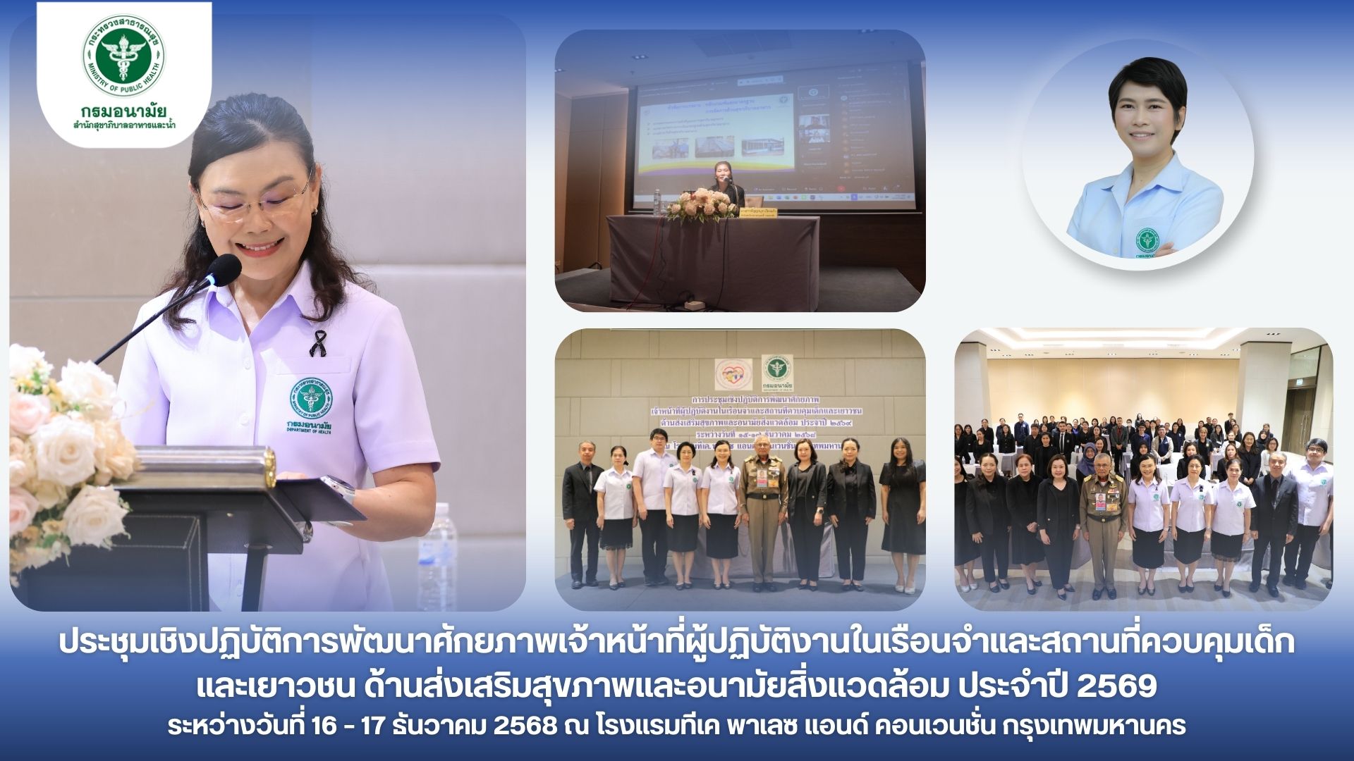 ผอ.ภิญญาพัชญ์ จุลสุข ผู้อำนวยการสำนักสุขาภิบาลอาหารและน้ำ มอบหมายให้ นายรัชชผดุง ดำรงพิงคสกุล รองผู้อำนวยการสำนักสุขาภิบาลอาหารและน้ำ และเจ้าหน้าที่สำนักสุขาภิบาลอาหารและน้ำ เข้าร่วมเป็นวิทยากรและประชุมเชิงปฏิบัติการพัฒนาศักยภาพเจ้าหน้าที่ผู้ปฏิบัติงานในเรือนจำและสถานที่ควบคุมเด็กและเยาวชน ด้านส่งเสริมสุขภาพและอนามัย สิ่งแวดล้อม ประจำปี 2569 โดยมีวัตถุประสงค์เพื่อพัฒนาและเสริมสร้างศักยภาพด้านส่งเสริมสุขภาพและอนามัยสิ่งแวดล้อม แก่เจ้าหน้าที่ผู้ปฏิบัติงานในเรือนจำและสถานที่ควบคุมเด็กและเยาวชน