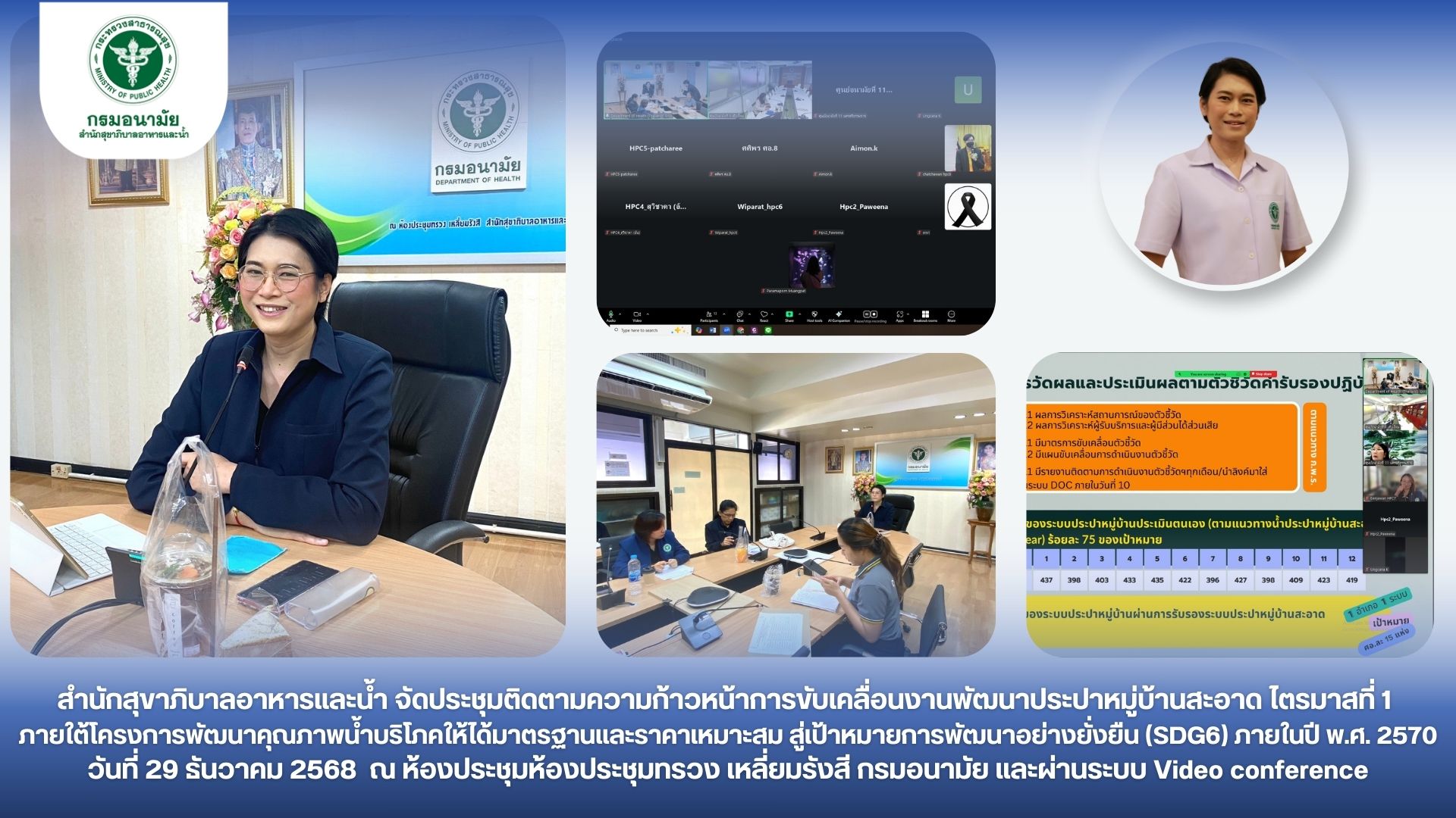 ผอ. ภิญญาพัชญ์ จุลสุข ผู้อำนวยการสำนักสุขาภิบาลอาหารและน้ำ เป็นประธานการประชุมติดตามความก้าวหน้าการขับเคลื่อนงานพัฒนาประปาหมู่บ้านสะอาด ไตรมาสที่ 1 ภายใต้โครงการพัฒนาคุณภาพน้ำบริโภคให้ได้มาตรฐานและราคาเหมาะสมสู่เป้าหมายการพัฒนาอย่างยั่งยืน (SDG6) ภายในปี พ.ศ. 2570 ผู้เข้าร่วมประชุมประกอบด้วยเจ้าหน้าที่จากสำนักสุขาภิบาลอาหารและน้ำ เจ้าหน้าที่ผู้รับผิดชอบงานพัฒนาระบบจัดการคุณภาพน้ำบริโภคของศูนย์อนามัยที่ 1-12 และกองห้องปฏิบัติการสาธารณสุขกรมอนามัย รวมทั้งสิ้นจำนวน 30 คน การประชุมครั้งนี้มีวัตถุประสงค์เพื่อติดตามความก้าวหน้าการดำเนินงาน ไตรมาสที่ 1 และแลกเปลี่ยนปัญหาอุปสรรคและความต้องการสนับสนุนการดำเนินงาน รวมทั้งเพื่อสนับสนุนและหาแนวทางการดำเนินงานร่วมกันให้บรรลุเป้าหมายที่กำหนด โดยมีมติสำคัญ ดังนี้ 1)มอบหมายให้ศูนย์อนามัยให้ข้อคิดเห็นต่อ(ร่าง)แบบประเมินคุณภาพระบบประปา 2)มอบหมายให้ทีมเลขา(สำนักสุขาภิบาลอาหารและน้ำ) จัดทำแบบรายงานการเฝ้าระวังคลอรีนอิสระคงเหลือปลายท่อเพื่อสนับสนุนการขอรับรองประปาหมู่บ้านสะอาด 3)กำหนดประชุมครั้งถัดไปในวันที่ 16 กุมภาพันธ์ 2569