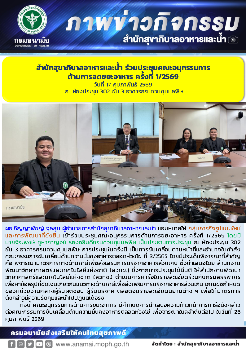 ผอ.ภิญญาพัชญ์ จุลสุข ผู้อำนวยการสำนักสุขาภิบาลอาหารและน้ำ มอบหมายให้ กลุ่มภารกิจรูปแบบใหม่และการพัฒนาที่ยั่งยืน เข้าร่วมประชุมคณะอนุกรรมการด้านการขยะอาหาร ครั้งที่ 1/2569 โดยมีนายจิระพงษ์ คูหากาญจน์ รองอธิบดีกรมควบคุมมลพิษ เป็นประธานการประชุม ณ ห้องประชุม 302 ชั้น 3 อาคารกรมควบคุมมลพิษ การประชุมในครั้งนี้ เป็นการขับเคลื่อนตามหน้าที่และอำนาจในคำสั่งคณะกรรมการขับเคลื่อนด้านความมั่นคงอาหารตลอดห่วงโซ่ ที่ 3/2565 โดยมีประเด็นพิจารณาที่สำคัญ คือ พิจารณามาตรการทางด้านภาษีเพื่อส่งเสริมการบริจาคอาหารส่วนเกิน ซึ่งนำเสนอโดย สำนักงานพัฒนาวิทยาศาสตร์และเทคโนโลยีแห่งชาติ (สวทช.) ซึ่งจากการประชุมได้มีมติ ให้สำนักงานพัฒนาวิทยาศาสตร์และเทคโนโลยีแห่งชาติ (สวทช.) ดำเนินการหารือในรายละเอียดร่วมกับกรมสรรพากร เพื่อหาข้อสรุปที่ชัดเจนเกี่ยวกับแนวทางด้านภาษีเพื่อส่งเสริมการบริจาคอาหารส่วนเกิน เกณฑ์ข้อกำหนด ของหน่วยงานกลางผู้รับผิดชอบ ผู้รับบริจาค ตลอดจนรายละเอียดนิยามต่าง ๆ เพื่อให้มาตรการดังกล่าวมีความรัดกุมและนำไปปฏิบัติได้จริง