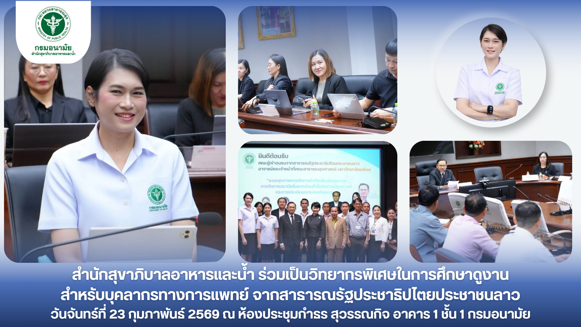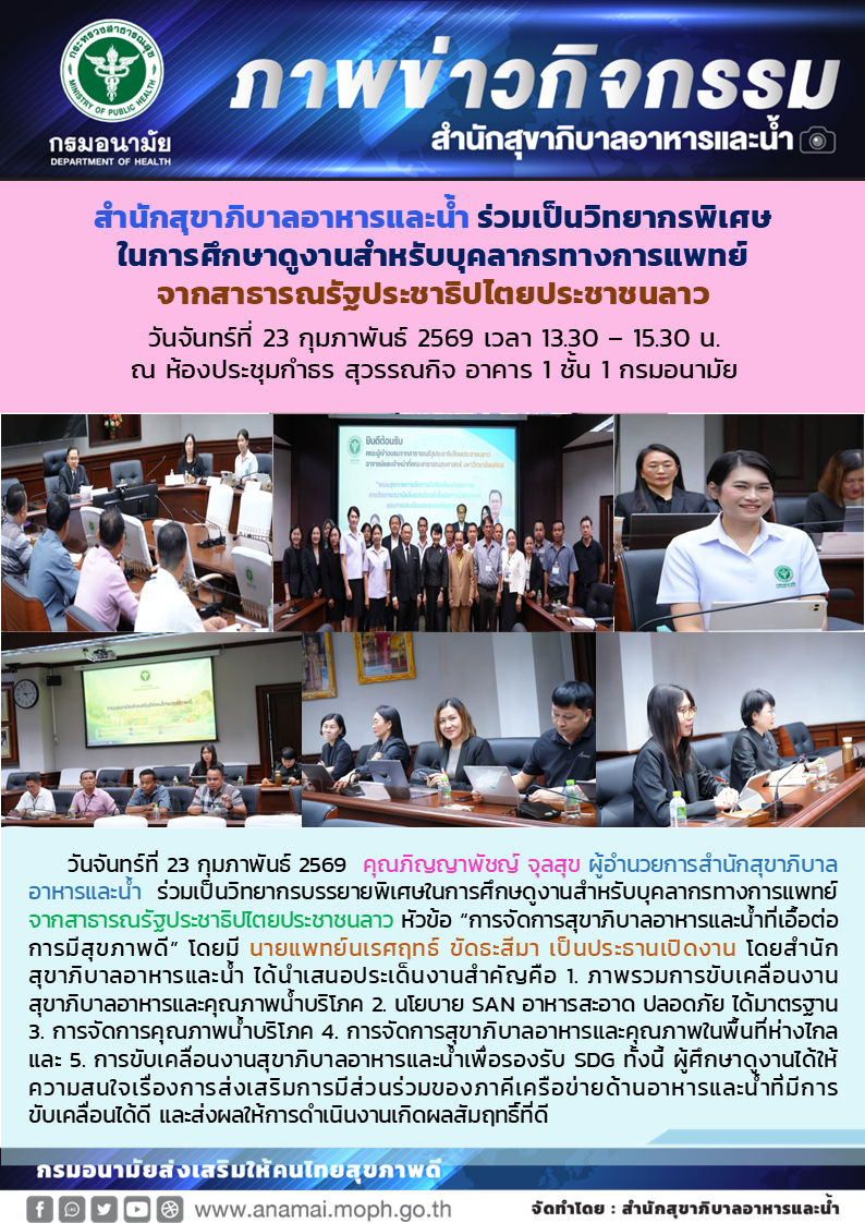 วันจันทร์ที่ 23 กุมภาพันธ์ 2569 คุณภิญญาพัชญ์ จุลสุข ผู้อำนวยการสำนักสุขาภิบาลอาหารและน้ำ ร่วมเป็นวิทยากรบรรยายพิเศษในการศึกษาดูงานสำหรับบุคลากรทางการแพทย์จากสาธารณรัฐประชาธิปไตยประชาชนลาว หัวข้อ “การจัดการสุขาภิบาลอาหารและน้ำที่เอื้อต่อการมีสุขภาพดี” โดยมี นายแพทย์นเรศฤทธ์ ขัดธะสีมา เป็นประธานเปิดงาน โดยสำนักสุขาภิบาลอาหารและน้ำ ได้นำเสนอประเด็นงานสำคัญคือ 1. ภาพรวมการขับเคลื่อนงานสุขาภิบาลอาหารและคุณภาพน้ำบริโภค 2. นโยบาย SAN อาหารสะอาด ปลอดภัย ได้มาตรฐาน 3. การจัดการคุณภาพน้ำบริโภค 4. การจัดการสุขาภิบาลอาหารและคุณภาพในพื้นที่ห่างไกล และ 5. การขับเคลื่อนงานสุขาภิบาลอาหารและน้ำเพื่อรองรับ SDG ทั้งนี้ ผู้ศึกษาดูงานได้ให้ความสนใจเรื่องการส่งเสริมการมีส่วนร่วมของภาคีเครือข่ายด้านอาหารและน้ำที่มีการขับเคลื่อนได้ดี และส่งผลให้การดำเนินงานเกิดผลสัมฤทธิ์ที่ดี