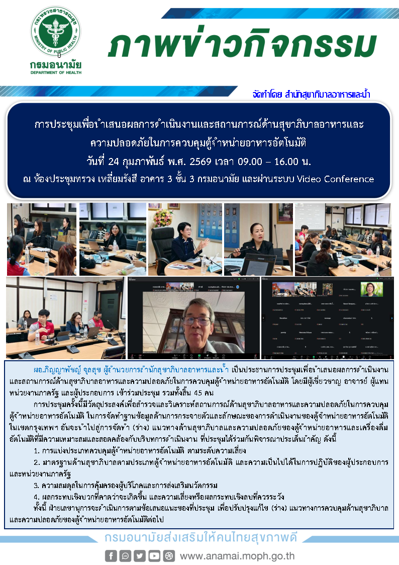 ผอ.ภิญญาพัชญ์ จุลสุข ผู้อำนวยการสำนักสุขาภิบาลอาหารและน้ำ เป็นประธานการประชุมเพื่อนำเสนอผลการดำเนินงานและสถานการณ์ด้านสุขาภิบาลอาหารและความปลอดภัยในการควบคุมตู้จำหน่ายอาหารอัตโนมัติ โดยมีผู้เชี่ยวชาญ อาจารย์ ผู้แทนหน่วยงานภาครัฐ และผู้ประกอบการ เข้าร่วมประชุม รวมทั้งสิ้น 45 คน