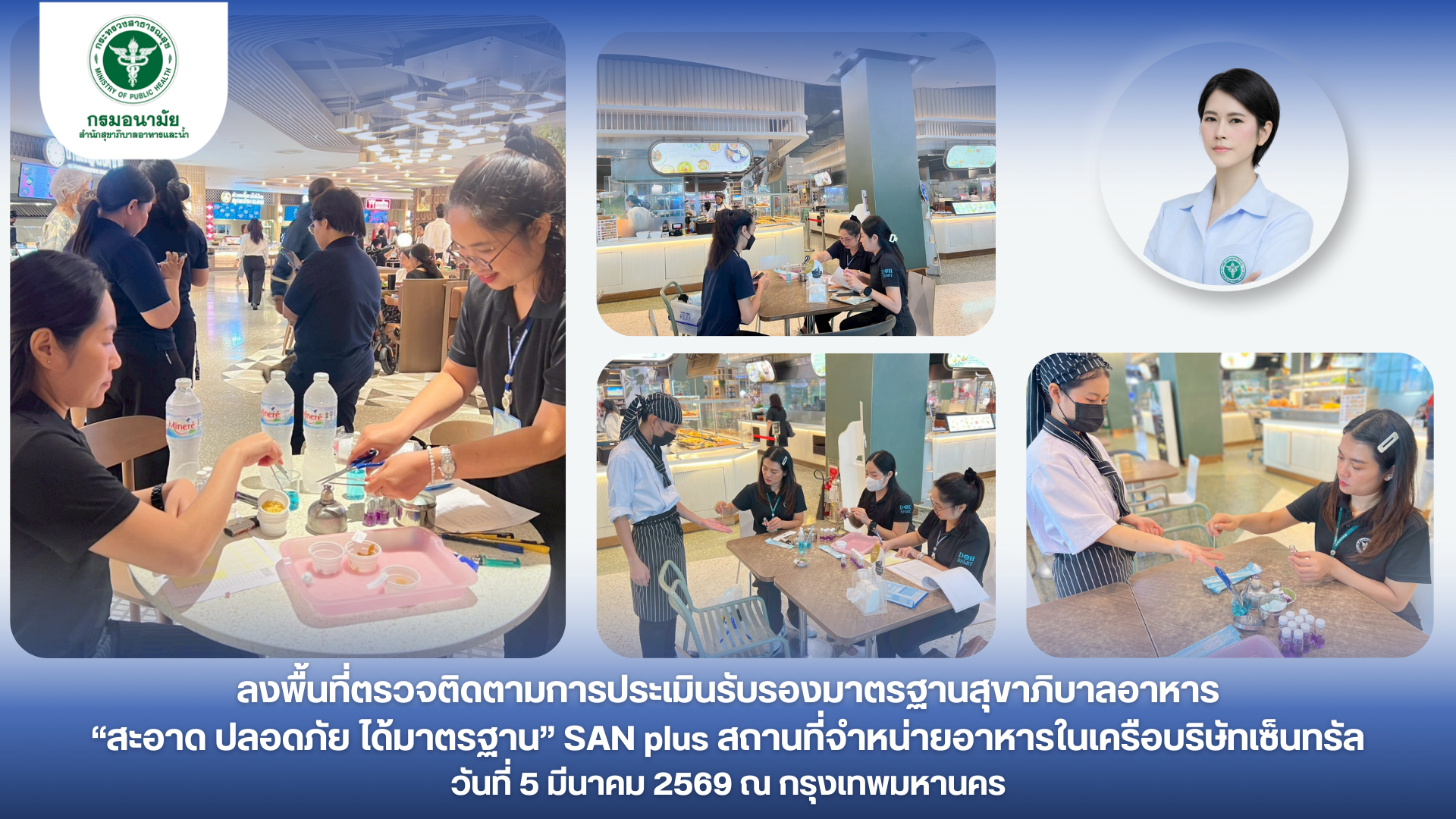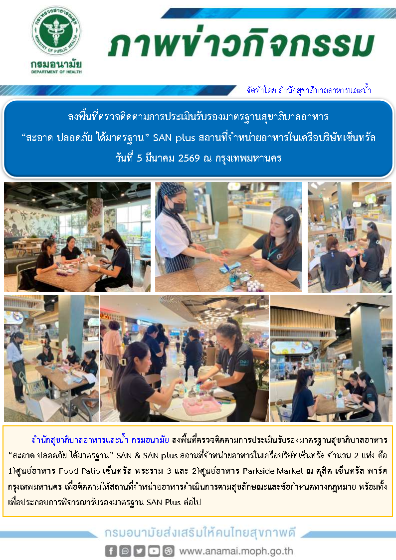 สำนักสุขาภิบาลอาหารและน้ำ กรมอนามัย ลงพื้นที่ตรวจติดตามการประเมินรับรองมาตรฐานสุขาภิบาลอาหาร “สะอาด ปลอดภัย ได้มาตรฐาน” SAN & SAN plus สถานที่จำหน่ายอาหารในเครือบริษัทเซ็นทรัล จำนวน 2 แห่ง คือ 1)ศูนย์อาหาร Food Patio เซ็นทรัล พระราม 3 และ 2)ศูนย์อาหาร Parkside Market ณ ดุสิต เซ็นทรัล พาร์ค กรุงเทพมหานคร เพื่อติดตามให้สถานที่จำหน่ายอาหารดำเนินการตามสุขลักษณะและข้อกำหนดทางกฎหมาย พร้อมทั้งเพื่อประกอบการพิจารณารับรองมาตรฐาน SAN Plus ต่อไป