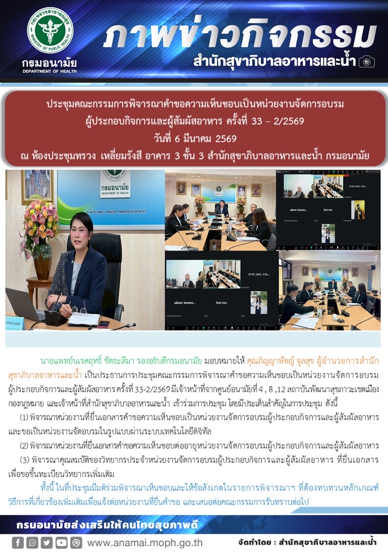 นายแพทย์นเรศฤทธิ์ ขัดธะสีมา รองอธิบดีกรมอนามัย มอบหมายให้ คุณภิญญาพัชญ์ จุลสุข ผู้อำนวยการสำนักสุขาภิบาลอาหารและน้ำ เป็นประธานการประชุมคณะกรรมการพิจารณาคำขอความเห็นชอบเป็นหน่วยงานจัดการอบรมผู้ประกอบกิจการและผู้สัมผัสอาหาร ครั้งที่ 33-2/2569 มีเจ้าหน้าที่จากศูนย์อนามัยที่ 4 , 8 ,12 สถาบันพัฒนาสุขภาวะเขตเมือง กองกฎหมาย และเจ้าหน้าที่สำนักสุขาภิบาลอาหารและน้ำ เข้าร่วมการประชุม โดยมีประเด็นสำคัญในการประชุม ดังนี้