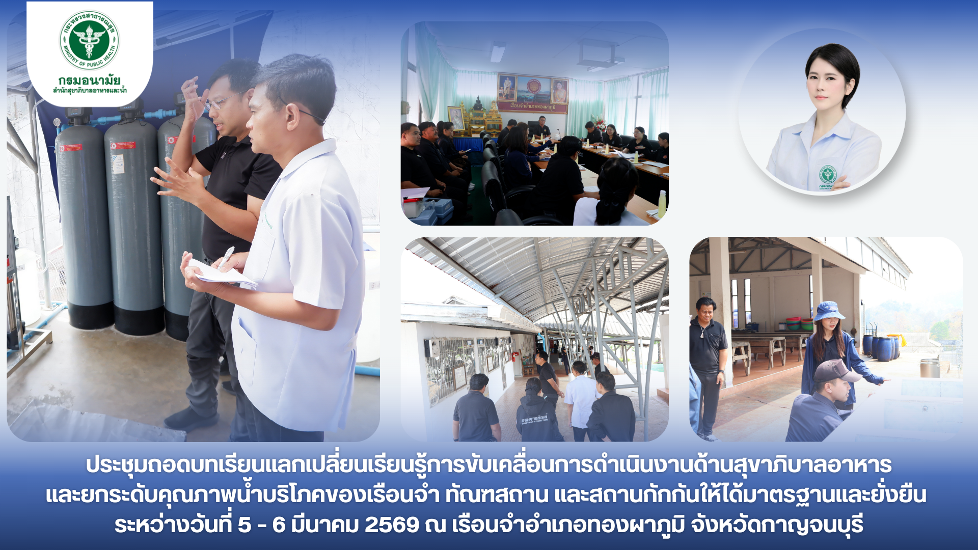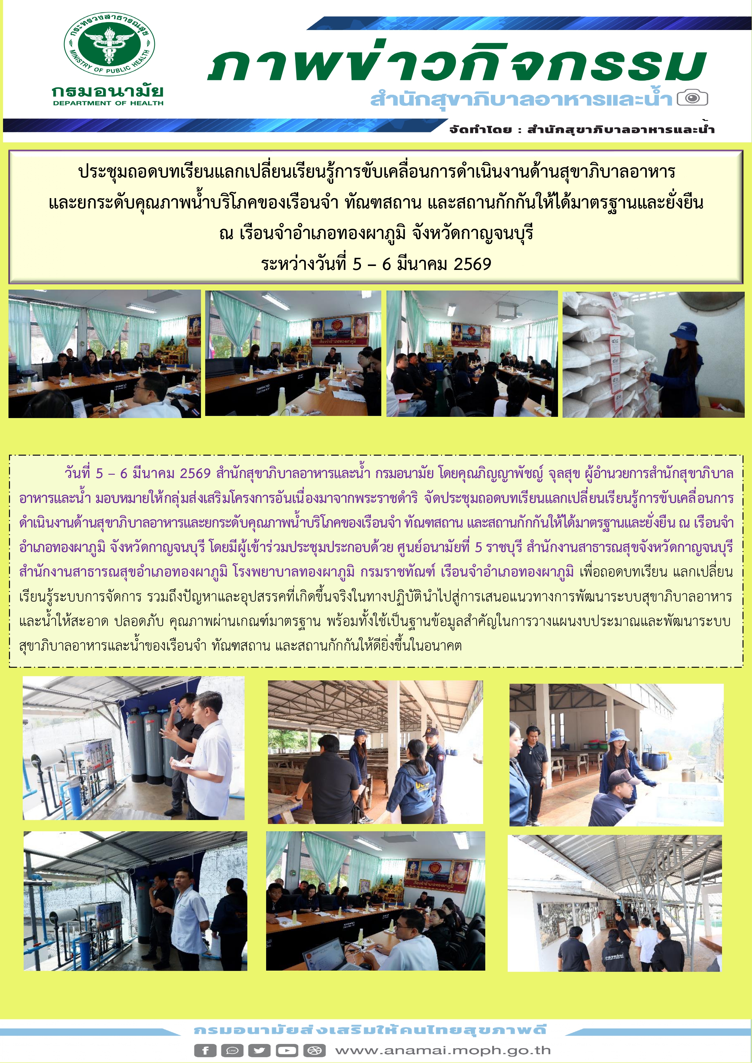 วันที่ 5 – 6 มีนาคม 2569 สำนักสุขาภิบาลอาหารและน้ำ กรมอนามัย โดยคุณภิญญาพัชญ์ จุลสุข ผู้อำนวยการสำนักสุขาภิบาลอาหารและน้ำ มอบหมายให้กลุ่มส่งเสริมโครงการอันเนื่องมาจากพระราชดำริ จัดประชุมถอดบทเรียนแลกเปลี่ยนเรียนรู้การขับเคลื่อนการดำเนินงานด้านสุขาภิบาลอาหารและยกระดับคุณภาพน้ำบริโภคของเรือนจำ ทัณฑสถาน และสถานกักกันให้ได้มาตรฐานและยั่งยืน ณ เรือนจำอำเภอทองผาภูมิ จังหวัดกาญจนบุรี โดยมีผู้เข้าร่วมประชุมประกอบด้วย ศูนย์อนามัยที่ 5 ราชบุรี สำนักงานสาธารณสุขจังหวัดกาญจนบุรี สำนักงานสาธารณสุขอำเภอทองผาภูมิ โรงพยาบาลทองผาภูมิ กรมราชทัณฑ์ เรือนจำอำเภอทองผาภูมิ เพื่อถอดบทเรียน แลกเปลี่ยนเรียนรู้ระบบการจัดการ รวมถึงปัญหาและอุปสรรคที่เกิดขึ้นจริงในทางปฏิบัตินำไปสู่การเสนอแนวทางการพัฒนาระบบสุขาภิบาลอาหารและน้ำให้สะอาด ปลอดภับ คุณภาพผ่านเกณฑ์มาตรฐาน พร้อมทั้งใช้เป็นฐานข้อมูลสำคัญในการวางแผนงบประมาณและพัฒนาระบบสุขาภิบาลอาหารและน้ำของเรือนจำ ทัณฑสถาน และสถานกักกันให้ดียิ่งขึ้นในอนาคต