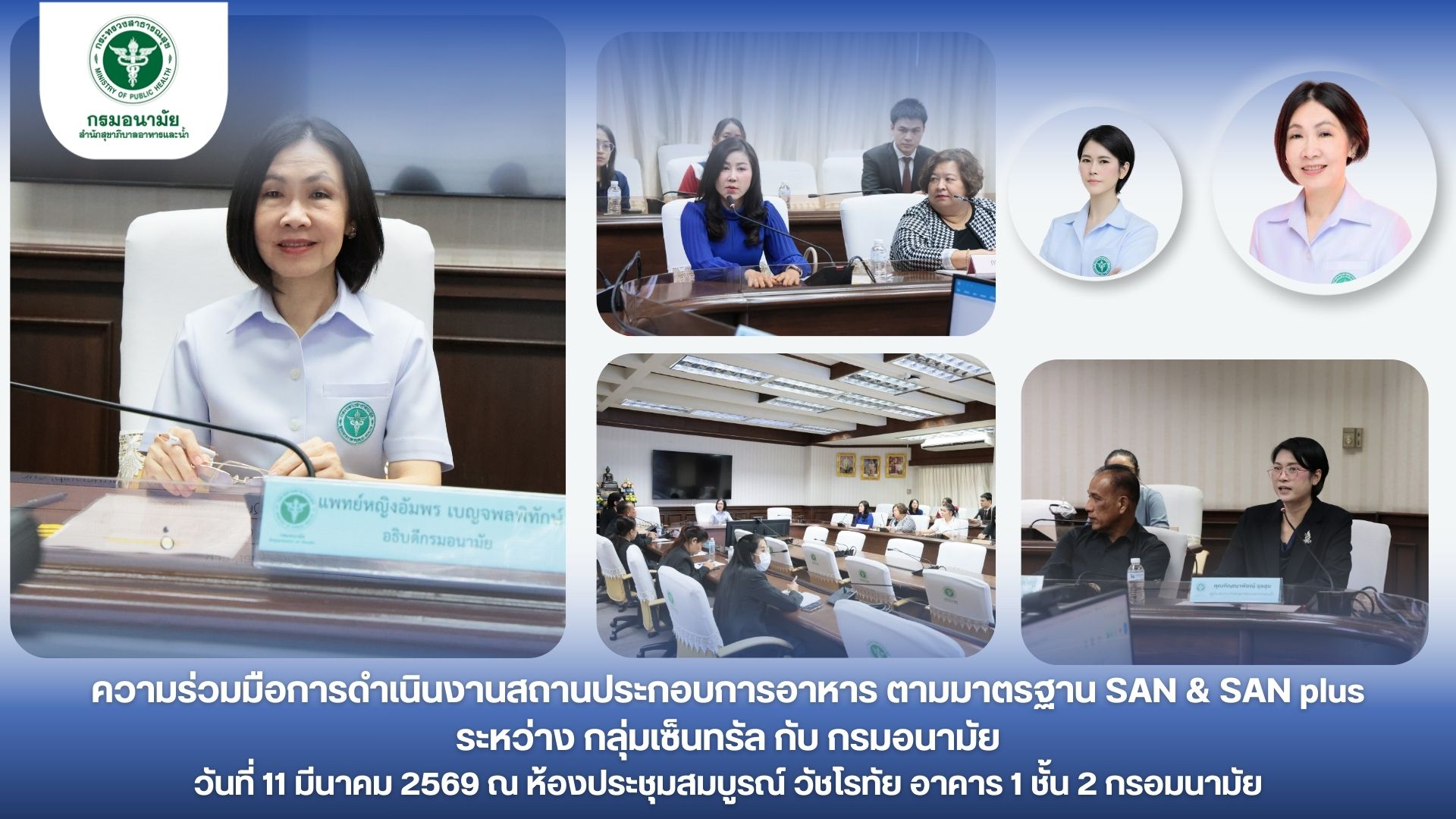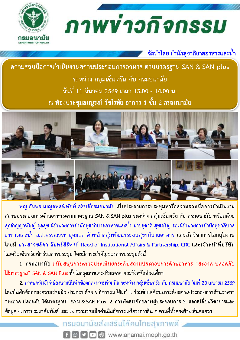 - กำหนดวันจัดพิธีลงนามบันทึกข้อตกลงความร่วมมือ ระหว่าง กลุ่มเซ็นทรัล กับ กรมอนามัย วันที่ 20 เมษายน 2569 โดยบันทึกข้อตกลงความร่วมมือ ประกอบด้วย 5 กิจกรรม ได้แก่ 1. ร่วมขับเคลื่อนยกระดับสถานประกอบการด้านอาหาร “สะอาด ปลอดภัย ได้มาตรฐาน” SAN & SAN Plus 2. การพัฒนาศักยภาพผู้ประกอบการ 3. แลกเปลี่ยนวิชาการและข้อมูล 4. การประชาสัมพันธ์ และ 5. ความร่วมมือดําเนินกิจกรรม/โครงการอื่น ๆ ตามที่ทั้งสองฝ่ายเห็นสมควร