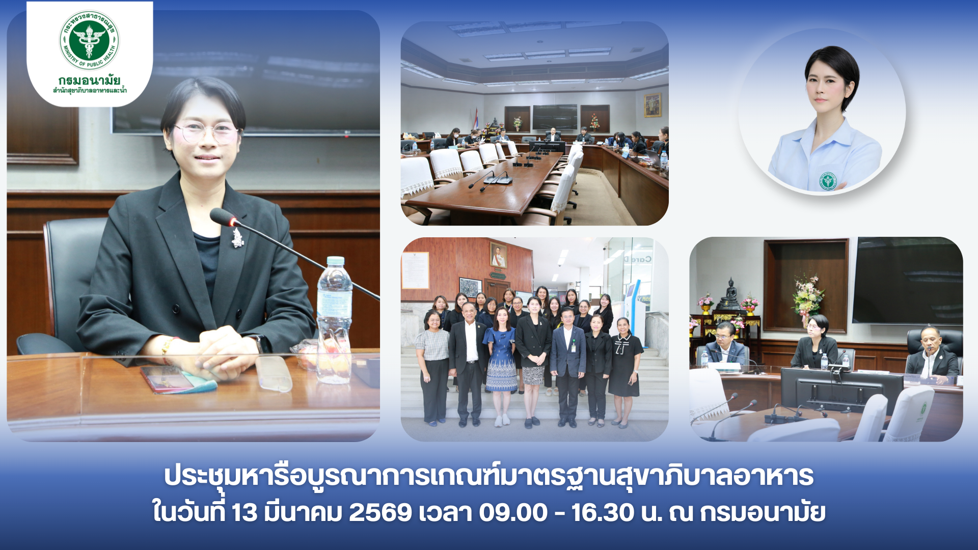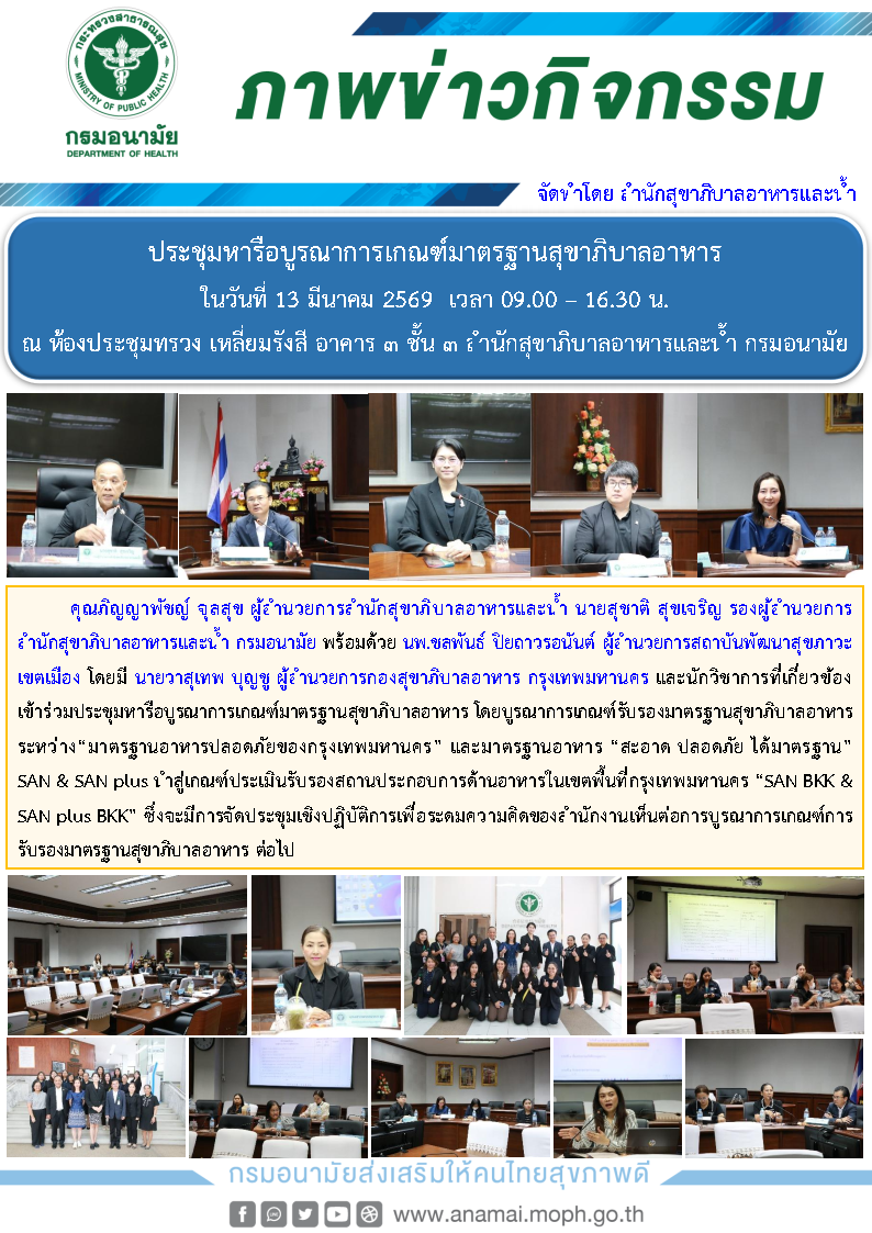คุณภิญญาพัชญ์ จุลสุข ผู้อำนวยการสำนักสุขาภิบาลอาหารและน้ำ นายสุชาติ สุขเจริญ รองผู้อำนวยการสำนักสุขาภิบาลอาหารและน้ำ กรมอนามัย พร้อมด้วย นพ.ชลพันธ์ ปิยถาวรอนันต์ ผู้อำนวยการสถาบันพัฒนาสุขภาวะเขตเมือง โดยมี นายวาสุเทพ บุญชู ผู้อำนวยการกองสุขาภิบาลอาหาร กรุงเทพมหานคร และนักวิชาการที่เกี่ยวข้องเข้าร่วมประชุมหารือบูรณาการเกณฑ์มาตรฐานสุขาภิบาลอาหาร โดยบูรณาการเกณฑ์รับรองมาตรฐานสุขาภิบาลอาหาร ระหว่าง“มาตรฐานอาหารปลอดภัยของกรุงเทพมหานคร” และมาตรฐานอาหาร “สะอาด ปลอดภัย ได้มาตรฐาน” SAN & SAN plus นำสู่เกณฑ์ประเมินรับรองสถานประกอบการด้านอาหารในเขตพื้นที่กรุงเทพมหานคร “SAN BKK & SAN plus BKK” ซึ่งจะมีการจัดประชุมเชิงปฏิบัติการเพื่อระดมความคิดของสำนักงานเห็นต่อการบูรณาการเกณฑ์การรับรองมาตรฐานสุขาภิบาลอาหาร ต่อไป