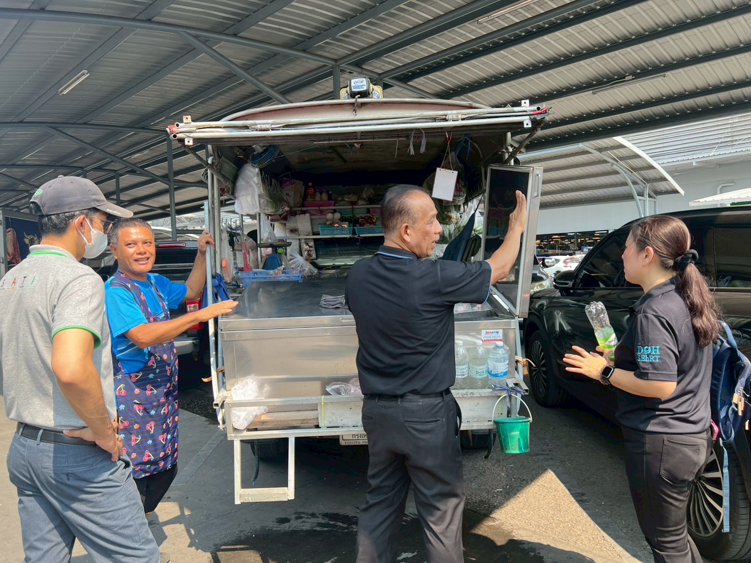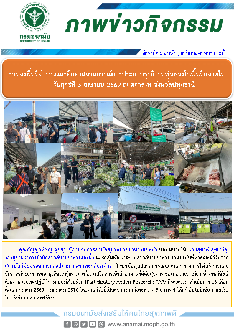 คุณภิญญาพัชญ์ จุลสุข ผู้อำนวยการสำนักสุขาภิบาลอาหารและน้ำ มอบหมายให้ นายสุชาติ สุขเจริญ รองผู้อำนวยการสำนักสุขาภิบาลอาหารและน้ำ และกลุ่มพัฒนาระบบสุขาภิบาลอาหาร ร่วมลงพื้นที่พาคณะผู้วิจัยจากสถาบันวิจัยประชากรและสังคม มหาวิทยาลัยมหิดล ศึกษาข้อมูลสถานการณ์และแนวทางการให้บริการและจัดจำหน่ายอาหารของธุรกิจรถพุ่มพวง เพื่อส่งเสริมการเข้าถึงอาหารที่ดีต่อสุขภาพของคนในเขตเมือง ซึ่งงานวิจัยนี้เป็นงานวิจัยเชิงปฏิบัติการแบบมีส่วนร่วม (Participatory Action Research: PAR) มีระยะเวลาดำเนินการ 13 เดือน ตั้งแต่มกราคม 2569 – มกราคม 2570 โดยงานวิจัยนี้เป็นความร่วมมือระหว่าง 5 ประเทศ ได้แก่ อินโนนีเซีย มาเลเซีย ไทย ฟิลิปปินส์ และศรีลังกา